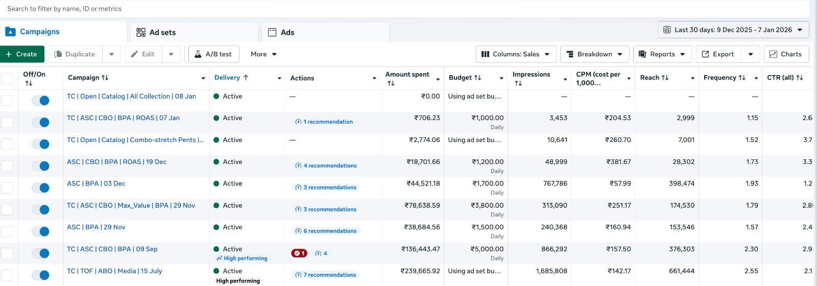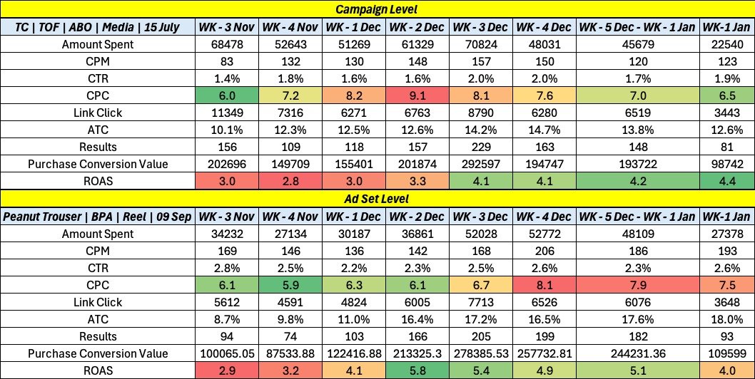 A) Deep analysis of CTR, CPC, CVR, ATC %, AOV & MER